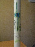 Ein rot-goldenes Kreuz ziert hier die Kerze. Rechts zwei Fische und Wellen, links der Kelch mit Hostie.